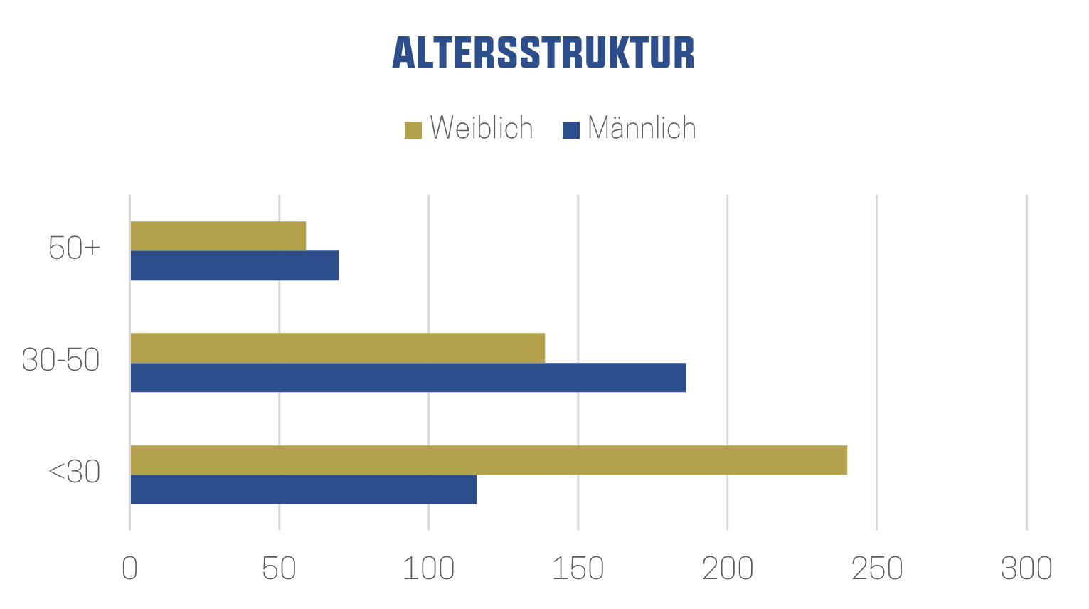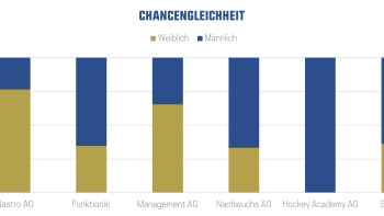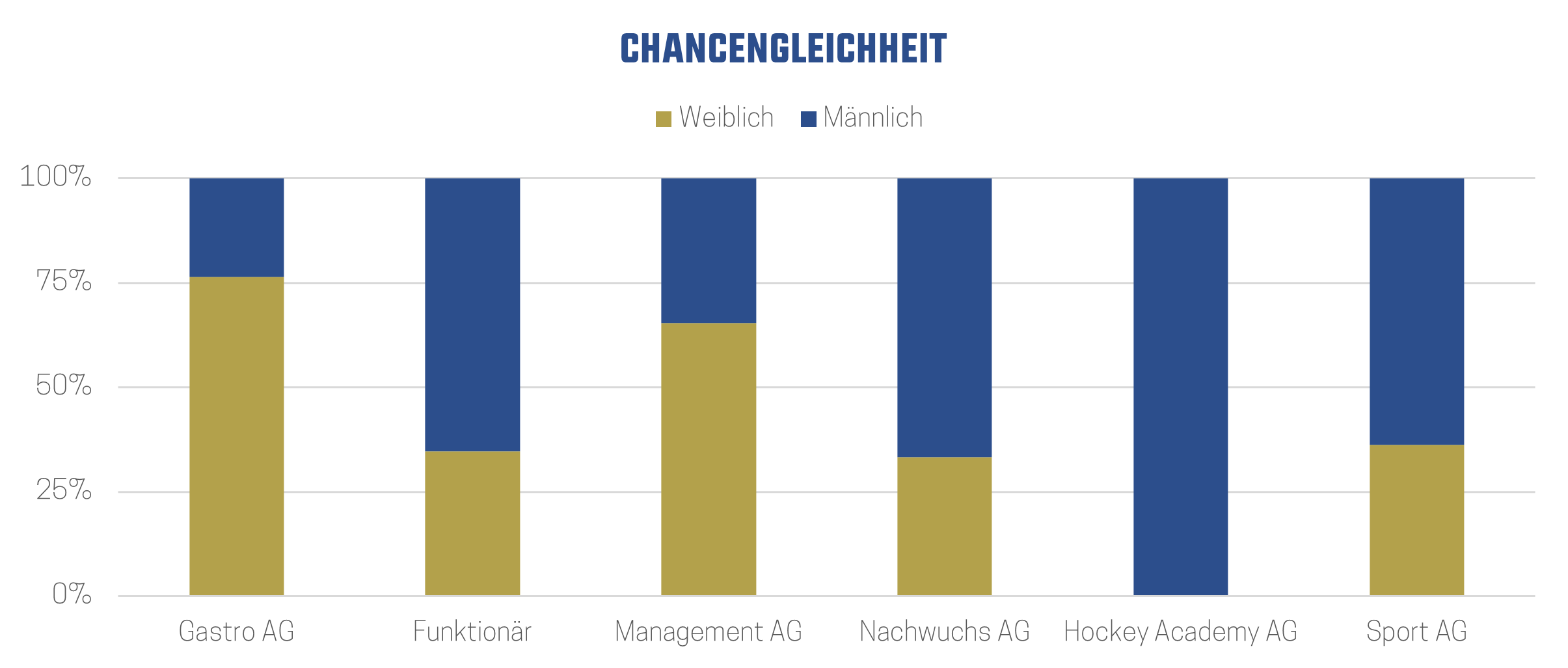 Der EVZ ist diversifiziert, was sich auch bei den unterschiedlichen Arbeitnehmenden zeigt. Die modernen Unternehmensstrukturen wiederspiegeln die erfolgreiche Chancengleichheit in der Gastro AG, Management AG und den Funktionären. Optimierungspotential besteht in der Nachwuchs AG, der Hockey Academy und der Sport AG.